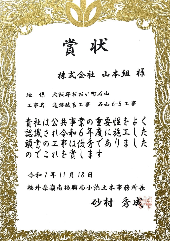 令和7年度 福井県優良工事土木事務所長表彰受賞しました。